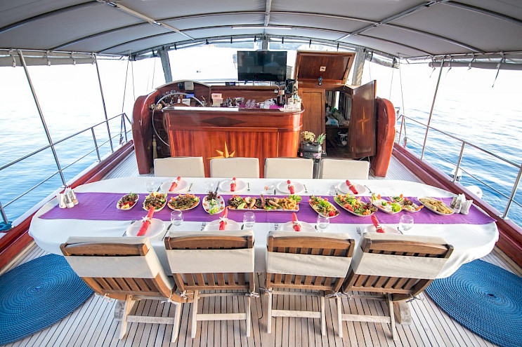 The gulet offers generous deck space with sun mattresses, a shaded aft seating and dining area for relaxed meals, and a cozy indoor saloon. She is a great choice for guests who value simplicity, comfort, and time spent at sea rather than luxury excess.