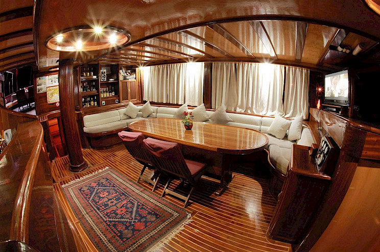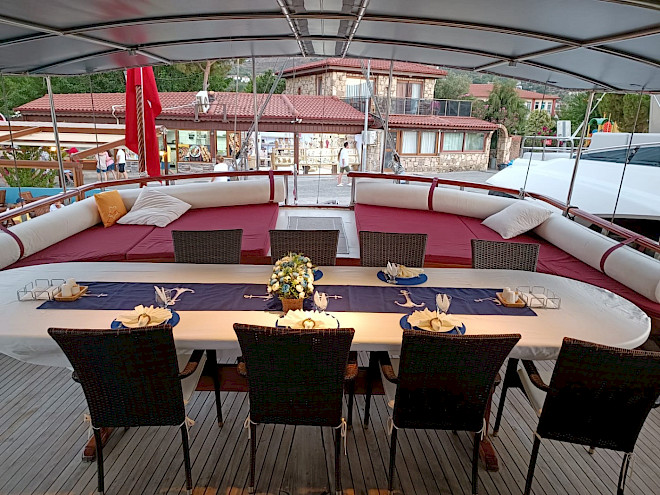 The gulet features wide outdoor living spaces, including a large aft seating and dining area ideal for social gatherings and relaxed meals, as well as ample sunbathing areas on deck. Her interior spaces are bright, modern, and thoughtfully arranged, offering guests a comfortable and practical onboard environment.